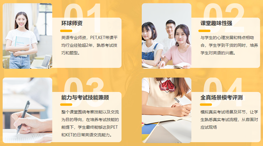 环球pet剑桥英培训班,PET全程班,旨在通过系统的教学和训练,帮助学生达到PET考试的合格标准,并全面提升其英语综合能力。课程内容涵盖了语法、词汇、阅读、写作、听力和口语等各个方面,采用多种教学方法和手段,激发学生的学习兴趣和积极性。通过PET全程课程的学习,学生能够进步自己的英语水平和PET考试成绩,为未来的学习和职业发展打下坚实的基础。